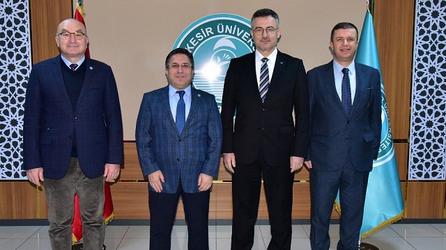Bursa Teknik Üniversitesi Rektörü Prof. Dr. Naci Çağlar, Balıkesir Üniversitesi Rektörü Prof. Dr. Yücel Oğurlu’yu makamında ziyaret etti. Rektör Yardımcıları Prof. Dr. Cevdet Avcıkurt ve Prof. Dr. Murat Doğdubay’ın da yer aldığı ziyarette, iki üniversite arasındaki akademik iş birlikleri, ortak araştırma projeleri ve yükseköğretimde kaliteyi artırmaya yönelik çalışmalar ele alındı. Görüşmede, üniversiteler arası deneyim paylaşımının önemine vurgu yapılırken; bilimsel üretkenliği artıracak ortak çalışmaların hayata geçirilmesine yönelik karşılıklı iyi niyet mesajları paylaşıldı. Rektör Prof. Dr. Yücel Oğurlu konuğu Bursa Teknik Üniversitesi Rektörü Prof. Dr. Naci Çağlar’a teşekkür ederken, Bursa Teknik Üniversitesi Rektörü Prof. Dr. Naci Çağlar da misafirperverliği dolayısıyla Rektör Prof. Dr. Yücel Oğurlu’ya teşekkürlerini sundu. Haber: Hasan AKAR