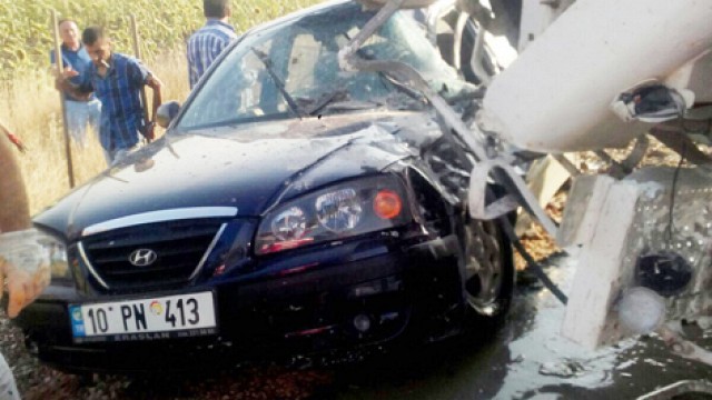 Balıkesir'in Bandırma ilçesinde tonlarca ağırlıktaki beton mikseri otomobilin üzerine devrildi. Kazada 4 kişi yaralandı. Edinilen bilgiye göre, Bandırma-Gönen yolu Beyköy sapağında, hazır beton firmasına ait 10 BV 904 plakalı Yusuf.K. yönetimindeki mikser, 10 PN 413 plakalı binek otomobilin üstüne devrildi. Kazada otomobilin sürücü mahallinde ağır hasar meydana gelirken, kaza mahalline gelen 112 Acil Servis ekiplerinin müdahalesi sonucu otomobilde bulunan Vildan Tonguç, Nihat Tonguç ve Tuğba Tonguç ile beton kamyonunun sürücüsü Yusuf K. Bandırma Devlet Hastanesi'ne kaldırılarak tedavi altına alındı. Hastaneye kaldırılan 4 kişinin durumlarının iyi olduğu ve ayakta tedavilerinin yapıldığı öğrenildi. Aracın üzerine devrilen beton mikserini kaldırmak için vinç çağırılırken, yol bir süre kısmen trafiğe kapalı kaldı. (İHA)