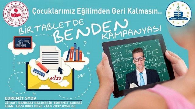 Edremit Kaymakamlığından yapılan basın açıklamasında şöyle denildi: Kaymakamımız Sayın Turgay ÜNSAL’ın teşvik ve destekleriyle başlattığımız bu kampanyaya katkılarınızı bekliyoruz. İlçemizde EBA’ya erişimi bulunmayan dar gelirli öğrencilerimize yönelik yapacağımız bu çalışma için bütün eğitim gönüllülerini göreve davet ediyoruz. Eğitim Camiamız, Belediyemiz, Kamu Yöneticilerimiz, Siyasi Partilerimiz, İş İnsanlarımız, STK’larımız, Esnaflarımız, Velilerimiz ve Hayırsever Halkımızı kampanyamızı desteklemeye davet ediyoruz. Kampanyaya katılım için görselde belirtilen Edremit Kaymakamlığı Sosyal Yardımlaşma ve Dayanışma Vakfı hesap numarasına bağışta bulunabilirsiniz, ya da en az 9 inç, 2 GB ram belleği olan EBA canlı ders uyumlu tabletleri Edremit Kaymakamlığı’na makbuz karşılığı teslim edebilirsiniz.