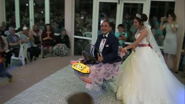 Düğünde, arkadaşlarının damada hediyesi hem gelini hem davetlileri şaşırttı Çanakkale'de dünya evine giren Gürkan ve Esin Çetin'e arkadaşları unutamayacakları bir düğün hediyesi verdi. Salona getirilen dev paketten çıkan market arabası, hem gelinle damadı hem de davetlileri şaşırttı. Ayvacık ilçesinde yaşayan Esin Can ve Gürkan Çetin, önceki gün düzenlenen bir düğün töreniyle dünya evine girdi. Damat Gürkan Çetin'in arkadaşları, genç çifte unutamayacakları bir hediye vermek istedi. Takı töreninden hemen önce, hediye vermek istediklerini söyleyen arkadaşları, salona dev bir koli getirdi. Heyecanla paketi açan Damat Çetin, içerisinden önünde 'Taksi' plakası olan, gelin arabası şeklinde süslenmiş bir market alışveriş arabası çıktığını gördü. Damat hediyeye anlam vermeye çalışırken, muzip arkadaşlar, bu sefer de bir direksiyon getirerek Gürkan Çetin'i alışveriş arabasının içerisine oturttu. Gelin Esin Can ise, eşini salonda bir süre gezdirdi. Arkadaşlarının damada hediyesi, davetlileri hem şaşırttı hem de güldürdü. Hediye araba ile hatıra fotoğrafı da çektirilmesinin ardından, düğün kaldığı yerden devam etti. (İHA)