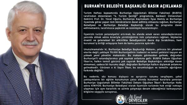Burhaniye Belediye Başkanı Ali Kemal Deveciler tarafından bir basın açıklaması yapıldı. Burhaniye Belediye Başkanı Ali Kemal Deveciler tarafından yapılan basın açıklamasında, “BURHANİYE BELEDİYE BAŞKANLIĞI BASIN AÇIKLAMASI Değerli Hemşehrilerimiz; Ülkemizin çeşitli bölgelerinde meydana gelen ve artık ulusal afet boyutuna ulaşan orman yangınları hepimizi derinden üzmüştür. Yangınla mücadelede hayatını kaybeden yurttaşlarımız ve ormanlarımızda yaşayan canlarımızın kaybı, acımızı daha da derinleştirmiştir.Diğer yandan, ülkemizde yaşanan ekonomik kriz had safhaya ulaşmış durumdadır. Halkımızın yaşadığı ekonomik sıkıntıların, hayat pahalılığının ve yaşam mücadelesinin farkındayız. Bu olağanüstü süreçte, Burhaniye Belediyesi olarak toplumun her kesimini etkileyen ekonomik kriz, orman yangınları ve yitirdiğimiz canlar nedeniyle; her yıl büyük emek ve coşkuyla gerçekleştirdiğimiz, ilçemizin kültür, sanat ve turizmine önemli katkılar sunan Ağustos 2025 ayı içerisinde yapılması planlanan Burhaniye - Ören Turizm, Kültür ve Sanat Festivalimizi, bu ulusal hassasiyete duyduğumuz derin saygı ve sorumluluk bilinciyle, halkımızın anlayışına ve hoşgörüsüne sığınarak iptal etme kararı almış bulunmaktayız. Anlayış ve dayanışma gösteren tüm halkımıza en içten dileklerimizle teşekkür eder, bu zor günleri birlikte dayanışma içinde aşacağımıza olan inancımızı bir kez daha vurgulamak isteriz. Saygılarımızla.” Denildi. (Bülten)