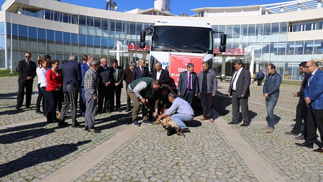 Burhaniye Belediyesi araç filosu genişlemeye devam ediyor. Her geçen gün daha fazla büyüyen ve gelişen Burhaniye’ye, daha iyi ve hızlı bir hizmet verebilmek adına, Burhaniye Belediyesi, araç filosunu genişletmeye devam ediyor. Burhaniye Belediyesi aynı zamanda Belediyenin kasasını zora sokmadan hibe yolu ile aldığı araçlar ile de araç hizmet ağını genişletiyor. Sadece 2016 yılında 7 aracı Burhaniye Belediyesine kazandıran Burhaniye Belediye Başkanı Necdet Uysal, hizmetlerin daha iyi ve hızlı bir şekilde devam etmesi için son olarak Türkiye Belediyeler Birliği’nden damperli kamyon hibesi alarak hizmete sundu. Araç Burhaniye Belediyesi hizmet binası önünde tanıtılırken kurban kesildi. Burhaniye Belediye Başkanı Necdet Uysal halkımıza hayırlı uğurlu olsun diyerek Türkiye Belediyeler Birliği’ne de yardımlarından dolayı teşekkür etti. Sözlerine “Her zaman daha iyi hizmet için çalışmalarımıza devam ediyoruz. Büyüyen Burhaniye’mizde kırsal mahallelerimizde dahil bir bütün olarak daha kaliteli hizmeti götürebilmek adına elimizdeki tüm imkanları kullanıyoruz” diye devam eden Burhaniye Belediye Başkanı Necdet Uysal ”Araç filomuzu genişletmeye devam edeceğiz” dedi.