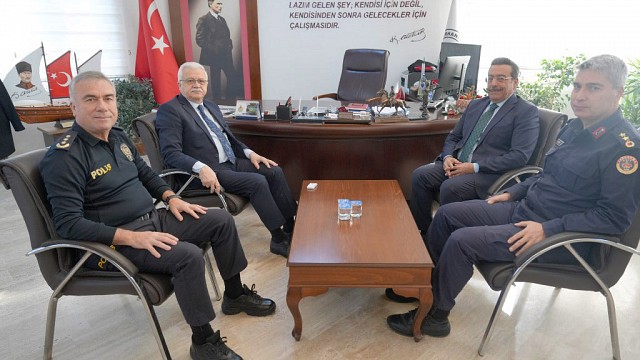 Burhaniye Kaymakamı Cumali Atilla, Burhaniye İlçe Emniyet Müdürü Faik Karabaş ve Burhaniye İlçe Jandarma Komutanı Yarbay Ünal Bayhan, Burhaniye Belediye Başkanı Ali Kemal Deveciler’i makamında ziyaret etti. İlçenin güvenliği ve kamu hizmetlerine yönelik güncel konuların ele alındığı ziyarette, kurumlar arası iş birliği ve koordinasyonun önemine vurgu yapıldı. Burhaniye Belediye Başkanı Ali Kemal Deveciler, nazik ziyaretlerinden dolayı Kaymakam Cumali Atilla, İlçe Emniyet Müdürü Faik Karabaş ve İlçe Jandarma Komutanı Yarbay Ünal Bayhan’a teşekkür ederek görevlerinde başarılar diledi. (Bülten)