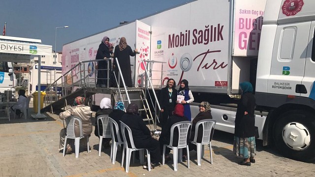 SAĞLIK HİZMETİ BÜYÜKŞEHİR İLE VATANDAŞIN AYAĞINA GİDİYOR Balıkesir Büyükşehir Belediyesinin "Balıkesir Büyük Aile Oluyor" projesi kapsamında İl Halk Sağlığı Müdürlüğüne tahsis ettiği "Mobil Sağlık Tırı" vatandaşları sağlık taramasından geçiyoruz. Sağlık tırı ile GGT, HPV, Kemik taraması, Mamografi ve şeker taraması yapılıyor. Balıkesir Büyükşehir Belediyesinin "Balıkesir Büyük Aile Oluyor" projesi kapsamında İl Halk Sağlığı Müdürlüğüne tahsis ettiği "Mobil Sağlık Tırı" vatandaşları sağlık taramasından geçiyoruz. Sağlık tırı ile GGT, HPV, Kemik, Mamografi ve şeker taraması yapılıyor. İlk olarak Maltepe Mahallesi’nde vatandaşlara hizmet veren Mobil Sağlık Tırı, geçtiğimiz hafta İvrindi’de sağlık taramalarında bulundu. Sağlık Tırı bu hafta ise Gündoğan Mahallesi’nde hizmet vermeye başladı. Özel olarak hazırlanan mobil sağlık tırı, içinde yer alacak teknolojik tıbbi cihazlarla "mobil dijital hastane" işlevi görüyor. Tam donanımlı mobil hastane olarak çalışacak mobil sağlık tırında, çeşitli kanser türleri için testler de yapılabiliyor. Sağlık tırı ile İvrindi’de bugüne kadar 93 GGT, 146 HPV, 631 kemik taraması, 344 mamografi ve 601 şeker taraması gerçekleştirildi. Sağlık tırı Balıkesir’in sırasıyla 1130 mahallesinde vatandaşlara hizmet verecek