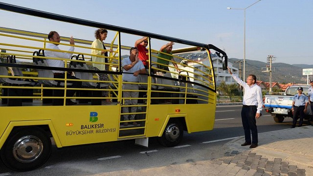 Balıkesir Büyükşehir Belediyesi, Edremit ilçesinin Altınoluk Mahallesi’nde hizmet vermesi amacıyla hazırlattığı üstü ve yanları açık yazlık otobüsü hizmete sokarken, ilk yolcuları Büyükşehir Belediye Başkanı Ahmet Edip Uğur karşıladı. YAZLIK OTOBÜS ALTINOLUK’TA HİZMETE GİRDİ Balıkesir Büyükşehir Belediyesi, toplu taşıma hizmetlerini Bandırma ve Edremit körfezlerinde deniz taksilerle genişletirken, yeni hazırlatılan 25 kişilik üstü ve yanları açık yazlık otobüste hizmete alındı. Edremit ilçesinin Altınoluk mahallesinde toplu taşıma hizmeti verecek olan yazlık otobüste Balıkesir Toplu Taşıma’nın sağladığı Balkartlar geçerli olacak. Çam Mahallesi ile Yağcılar mevki hattında çalışacak olan otobüsün ilk seferine AK Parti Balıkesir Milletvekili Kasım Bostan ve Büyükşehir Belediye Başkanı Ahmet Edip Uğur katıldı. Otobüste muavinlik yapan başkan Uğur, ilk seferlerden ücret alınmamasını istedi. İlk kez üstü ve yanları açık bir belediye otobüsü gördüklerini söyleyen tatilciler, Belediye Başkanı Uğur’a teşekkür etti. Milletvekili Bostan ve başkan Uğur, akşam saatlerine kadar molalar vererek otobüste seyahat etti. Konuyla ilgili açıklama yapan Büyükşehir Belediye Başkanı Ahmet Edip Uğur, “Büyükşehir Belediyesi olarak, ulaşımda yazlık araçla hizmet etmeye başladık. İçinde bulunduğumuz araç, üstü açılıp kapanabilir, yanları açıktır. Altınoluk’a gelen tatilcilerimizin, bölge halkımızın daha rahat, konforlu seyahat etmesi için bu aracımızı bugün hizmete alıyoruz. Daha sonra Akçay’da ve Burhaniye’de de bu araçlarımızın devamları olacak. Dün de Altınoluk sahilinde yaptığımız yeni düzenlemeyi incelemiştik. Daha önce Ulaştırma Bakanlığı’nın kıyı erozyonunu önlemek için yaptığı tahkimatın üzerine, iskeleler ve şemsiyelerle bir proje yaptık. İstiyoruz ki, Altınoluk’a gelen bütün turistleri memnun edelim. Daha kaliteli bir hizmet verilsin. İnşallah bu hizmetlerimiz devam ediyor. Bu otobüsümüz de Altınoluk’a, Balıkesir’e hayırlı uğurlu olsun” dedi. Yolcular ise hizmeti çok güzel ve kullanışlı bulduklarını ifade ederek, Belediye Başkanı Uğur’u otobüste görmekten mutluluk duyduklarını söyledi. Başkan Uğur, Milletvekili Bostan ile birlikte, mola verdikleri Çam Mahallesi’ndeki bir sanat atölyesini de ziyaret etti. Atölye sahibi sanatçı Filiz Yılmaz, çalışmalarıyla ilgili bilgiler verdi. Başkan Uğur, son olarak Balıkesir Toplu Taşıma bünyesinde hizmet veren Mıhlı Bekle Merkezi’ni ziyaret etti.