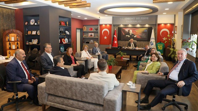 T.C Çevreci Belediyeler Birliği Mayıs Ayı Olağan Encümen Toplantısı Edremit’te gerçekleştirildi. Birlik Başkanı Ali Kemal Deveciler ve encümen üyeleri toplantı öncesi ev sahipliği yapan Edremit Belediye Başkanı Mehmet Ertaş’ı makamında ziyaret etti. Düzenlenen ziyaretin ardından toplantıya geçildi. Birlik çalışmalarının değerlendirildiği toplantıda gündemdeki konu başlıkları görüşülerek, önümüzdeki süreçlerde yapılacak çalışmalarla ilgili kararlar alındı. Birlik Başkanı Ali Kemal Deveciler düzenlenen Mayıs Ayı Olağan Encümen Toplantısının ardından açıklamalarda bulunarak, “Yedi farklı bölgeden, otuz farklı şehirden toplam 120 belediyenin katılımıyla giderek daha güçlü ve etkin bir yapıya kavuşan T.C. Çevreci Belediyeler Birliği olarak, etki alanımızı yalnızca Kaz Dağları ile sınırlı tutmadan, Türkiye genelindeki çevre sorunlarına yönelik çalışmalarımıza kararlılıkla devam edeceğiz. Kentlerimizin geleceği için hep birlikte mücadele etmekten büyük onur ve gurur duyuyorum.” dedi. Edremit Belediye Başkanı Mehmet Ertaş ise yaptığı açıklamada, “Ege ve Marmara Çevreci Belediyeler Birliği Mayıs Ayı Olağan Encümen Toplantımızı gerçekleştirmek üzere Birlik Başkanımız, Burhaniye Belediye Başkanı Ali Kemal Deveciler, Dikili Belediye Başkanı Adil Kırgöz, Milas Belediye Başkanı Fevzi Topuz, Şarköy Belediye Başkanı Alpay Var, Alaşehir Belediye Başkanı Ahmet Öküzcüoğlu, Didim Belediye Başkanı Hatice Gençay, Bozkurt Belediye Başkanı Birsen Çelik, Çanakkale Belediyesi Meclis üyesi Fatma Kaynaş, Birlik Başkan Vekili Coşkun Tanış, Birlik Meclis üyesi Gümüşhacıköy Belediye Başkanı Zehra Özyol ve Birlik Genel Sekreteri İmam Bakır Damar ile bir araya geldik. Değerli belediye başkanlarımızı belediyemizde ağırlamanın mutluluğunu yaşadık. Birlik Başkanı, Burhaniye Belediye Başkanımız Ali Kemal Deveciler başkanlığında gerçekleştirdiğimiz toplantıda; çevremizi korumak, kaynakları verimli kullanmak ve yeşil bir gelecek için daha fazla adım atma konusunda fikirlerimizi paylaştık, gündem maddelerini görüşüp yeni yapılacak çalışmaları değerlendirdik. Belediyelerimiz arasında güçlü iş birlikleri kurmak ve bölgemizin ortak ihtiyaçlarına yönelik çalışmalar yapmak adına verimli görüşmeler gerçekleştirdik. Alınan kararların hayırlı olmasını diliyor, değerli belediye başkanlarımıza teşekkür ediyorum.” Dedi.