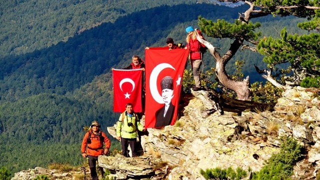 Edremit ilçesinde bulunan Kazdağlarına Cumhuriyet için tırmanan dağcılar bin 500 metre yükseklikte bayrak açıp saygı duruşunda bulundular. Dağcılar yaptıkları zirve yürüyüşü sonrasında başarılı bir şekilde geri döndüler. Keşif Yolcuları grubu Cumhuriyet Bayramı nedeniyle 29 Ekim’de başladıkları Kazdağları Sazak Mevkii Teke Kayası ve güney cephesinde Taşbaşı Zirvelerine zirve yürüyüşü yaptılar. Ormanlık ve sarp bir alanda bin 500 metre rakıma çıkabilmek için 20 kilometre yol yürüyen dağcılar etkinliği başarılı bir şekilde sonlandırdı. Keşif Yolcuları Grubu Kazdağlarının Balıkesir ve Çanakkale’de ki iki yüzünde de bayrak açarak saygı duruşunda bulundular. (İHA)