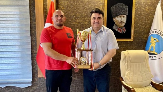 Edirne’de düzenlenen 661. Tarihi Kırkpınar Yağlı Güreşleri Başpehlivanlık Yarı Final müsabakasında Başpehlivanlık Boyunda 3. olan Ertuğrul Dağdeviren, Belediye Başkanı Emin Ersoy’u makamında ziyaret ederek kupayı getirdi. Başkan Ersoy, ziyaretlerinden dolayı Dağdeviren’e teşekkür etti ve 661. Tarihi Kırkpınar Yağlı Güreşlerindeki başarısından dolayı kendisini tebrik etti. Haber: Rümeysa Günnur KURT