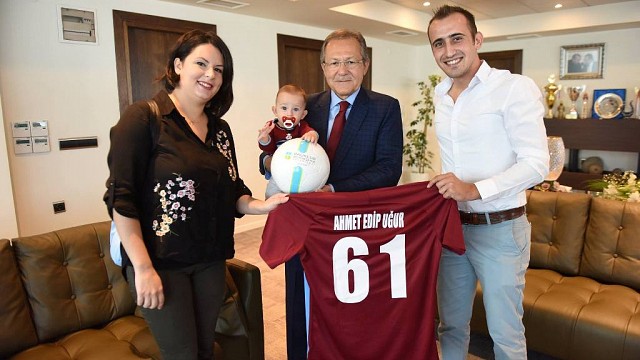 Trabzonspor ile sözleşme imzalayarak transfer olan Balıkesirli Maviş ailesinin oğulları altı aylık Bordo Maviş, Balıkesir Büyükşehir Belediye Başkanı Ahmet Edip Uğur’u ziyaret etti. Trabzonspor'un, yeni sezondaki son transferi Bordo-Maviş oldu. Henüz altı aylık Bordo Maviş ile sözleşme imzalayan bordo-mavili kulüp, altyapısına minik bir oyuncu kazandırdı. Balıkesirli Ulaş ve Burcu Maviş'in oğulları Bordo Maviş, Büyükşehir Belediye Başkanı Ahmet Edip Uğur’u ziyaret etti. Başkan Uğur’a Bordo Maviş’in hikayesini anlatan Ulaş ve Burcu Maviş, Uğur’a Trabzonspor forması hediye ettiler. Maviş ailesini ve bebeklerini tebrik eden Başkan Uğur’a bebek futbolcuya top hediye etti. Başkan Uğur, küçük yıldızın yaşamında başarılı olması dileklerinde bulundu. Aile ve Başkan Uğur ziyaret sonunda fotoğraf çektirdiler. HAYALLERİ GERÇEK OLDU Balıkesirli Ulaş ve Burcu Maviş'in altı aylık oğulları Bordo'nun hikayesi beş yıl öncesine uzanıyor. Baba Ulaş Maviş, 2012 yılında bir rüyasında oğlunun olduğunu ve ismini Bordo koyduklarını görüyor. Aradan beş sene geçtikten sonra o dönemki kız arkadaşı Burcu ile hayatını birleştiren Ulaş Maviş'in rüyası, 2017'de oğlunun dünyaya gelmesi ile gerçek oluyor. Burcu ve Ulaş çifti çocuklarının ismini Bordo koyarak dünyada bir ilke imza atıyor.
