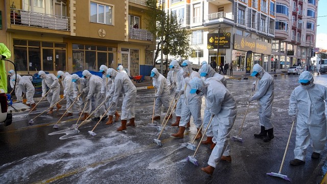 Dursunbey Belediyesi ekipleri, koronavirüs önlemleri kapsamında ana cadde ve sokakları köpüklü su ve solüsyonla dezenfekte etti. Tulum giyen onlarca temizlik görevlisinin temizlik çalışması ilginç görüntülere sahne oldu. Dursunbey Belediyesi Çevre koruma ve kontrol müdürlüğü bünyesinde oluşturulan ekiplerle yapılan çalışmada, temizlik aracına konulan dezenfekte solüsyonu ve yüzey temizleyicisi ile ana caddeler ve sokaklar köpük köpük yıkandı. Tulum giyen temizlik ekipleri fırça ile köpüklü temizlik çalışması gerçekleştirdi. Çevre koruma ve kontrol müdürü Yasemin Kurtlarılıoğlu, özellikle vatandaşların yoğun kullandığı alanlarda koronavirüs ile mücadele kapsamında çalışma yaptıklarını söyledi.Merkezden başlanan cadde ve sokakların yıkanmasının çevre mahallelerde de uygulanacağını vurgulayan Kurtlarlıoğlu; "Dursunbey Belediyesi olarak pandemi sürecinde etkin bir mücadele gerçekleştirdik. Haftalaık olarak çeşitli mahallelerimizde gerçekleştirdiğimiz temizlik çalışmalarımızın yanı sıra, cadde, sokak ve meydanlarda yıkama işlemine başladık. Ekiplerimiz dezenfekte ve ilaçlama işlemleri yapıyor, ardından da bölgeyi temizleyerek, köpükle yıkıyor. Hem koronavirüse karşı temizlik seviyesini artırıyoruz, koruyucu önlem sağlıyoruz hem de kentimiz temiz görünüme kavuşuyor, hijyeni sağlanıyor. Kullandığımız dezenfekte ve köpük sayesinde mikropları arındırıyoruz. Koronavirüs ve benzeri hastalıkların önüne geçmeyi hedefliyor, yayılmasını da durdurmaya gayret ediyoruz." dedi. Haber: Aydın DEMİRKAYA