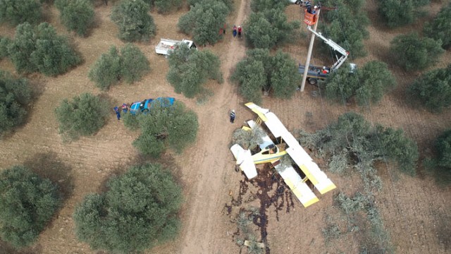 Balıkesir'in Edremit ilçesinde düşen ilaçlama uçağı İhlas Haber Ajansı tarafından havadan görüntülendi. Edremit'in Dereli Mahallesi Kozyatağı mevkiinde saat 09.40 sıralarında zeytin ilaçlaması yapan uçak, motor arızası sebebiyle önce elektrik tellerine çarpıp zeytinlik araziye düştü. Tek kişilik uçağın pilotu Rıfat Kamil Koçman, kazadan yara almadan kurtuldu. Kaza sonrasında olay yerine çok sayıda itfaiye, ambulans ve jandarma ekibi sevk edildi. Uçağın tarım ilacı taşıması sebebiyle bölgeye UMKE ekipleri de sevk edildi. Yapılan incelemede uçağın tanklarında ilaç sızıntısı olmadığı tespit edildi. Kaza sonrasında bölgede geniş güvenlik tedbiri alınırken, İhlas Haber Ajansı kaza bölgesini ve düşen uçağı havadan görüntüledi. Havada motoru arızalanan uçağın pilotu tarafından üstün bir çaba ile en az kırım ve zarar ile indirilmeye çalışıldığı öğrenildi. (İHA)