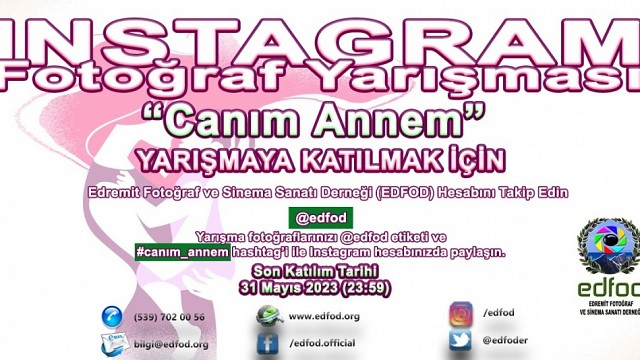 Edremit Fotoğraf ve Sinema Sanatı Derneği (EDFOD) Instagram Fotoğraf Yarışması başladı. Edremit Fotoğraf ve Sinema Sanatı Derneği (EDFOD) Başkanı Özcan Şimşek konuyla ilgili olarak yaptığı açıklamada, “Fotoğrafçıların teknik bilgi ve becerilerini değerlendirmelerini sağlamaları maksadıyla periyodik olarak düzenlediğimiz yarışmalardan birisi daha başladı. “Canım Annem” temalı yarışma, Instagram platformu üzerinden düzenlenmiş olup, katılımcılar kendi Instagram hesaplarında @edfod etiketi ve #canım_annem hashtag’i ile paylaşacakları fotoğraflar ile yarışmaya katılabileceklerdir. Yarışmanın son katılım tarihi 31 Mayıs 2023’dir. Ödüllendirilecek fotoğrafların dışında en çok beğeniyi alan 50 fotoğraftan oluşan bir sergi EDFOD SANAL GALERİDE açılacak olup, sonuçlar 5 Haziran 2023 tarihinde açıklanacaktır. Yarışma ile ilgili detaylı bilgi ve şartnameye https://www.edfod.org/instagram-fotograf-yarismasi-canim_annem/ adresinden ulaşılabilecektir.” Dedi. Haber: Huriye AY
