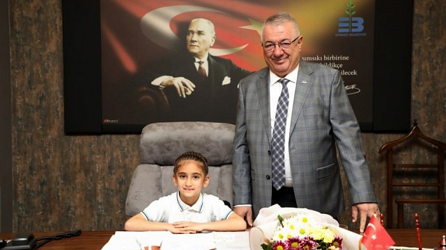 23 Nisan Ulusal Egemenlik ve Çocuk Bayramı sebebiyle Edremit Belediye Başkanı Mehmet Ertaş, koltuğunu Karagözoğlu İlkokulu öğrencisi Begüm Taşkıran’a devretti. Çocuk Başkan Taşkıran, Edremit’in en temiz ilçe olması için talimat verdi. Edremit Belediye Başkanı Mehmet Ertaş, Karagözoğlu İlkokulu 1. Sınıf öğrencisi Begüm Taşkıran, Müdür Yardımcısı Hatice Tokatlı ve sınıf öğretmeni Sonay Yılmaz’ı kabul etti. Başkan Ertaş, 23 Nisan Ulusal Egemenlik ve Çocuk Bayramı sebebiyle Belediye Başkanlığı koltuğunu Karagözoğlu ilkokulu 1/B sınıfı öğrencisi Begüm Taşkıran’a bıraktı. Belediye Başkanlığı koltuğunu devralan minik Başkan Begüm Taşkıran, “Biz çocuklar için çok önemli olan 23 Nisan Ulusal Egemenlik ve Çocuk Bayramı’nda, Türkiye Cumhuriyeti’nin kurucusu ve biz çocuklara bayram armağan eden ulu önderimiz Mustafa Kemal Atatürk’ü minnet ve şükranla anıyoruz. Bizi bugün makamında ağırlayarak onurlandıran Sayın Belediye Başkanımız Mehmet Ertaş’a ve burada bulunan herkese teşekkür ederim” dedi. Ardından minik Başkan Begüm Taşkıran, Temizlik İşleri Müdürü İsmail Hakkı Akkoyun’a Edremit’in Türkiye’nin en temiz şehri olması için talimat verdi. Çevrenin kirletilmemesi ve çocuklara temiz bir dünya bırakılması temennisinde bulundu. Başkan Ertaş, Atamızın çocuklara armağanı bu özel günde görevini geleceğimizin ve aydınlık yarınlarımızın teminatı çocuklara bırakmanın heyecanını yaşadığını ifade etti. “Geleceğimiz olan siz çocuklara emanet etmekten mutluluk duydum. Bende Edremitliler adına sizlere ve tüm çocuklarımıza teşekkür ediyorum.” dedi.