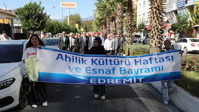 Edremit ilçesinde 37. Ahilik Haftası kapsamında düzenlenen kutlamalar, renkli ve anlamlı etkinliklerle gerçekleştirildi. Ahilik Haftası kutlamaları kapsamında Altınoluk ve Akçay Mahallesi’nde lokma hayrı düzenlendi. 9 Ekim Çarşamba günü ise ilk olarak Edremit Cumhuriyet Meydanı’nda çelenk sunumu yapıldı. Ardından Esnaf Odaları Başkanları, Kaymakamlık, Belediye Başkanlığı, İlçe Milli Eğitim Müdürlüğü ve Jandarma Komutanlığını ziyaret etti. Ardından ise Şehit Hamdibey Meydanı’ndan Cumhuriyet Meydanı’na kortej yürüyüşü gerçekleştirildi. Protokol üyeleri, esnaflar ve vatandaşlardan oluşan kortej, 50 metre uzunluğundaki Türk Bayrağı ile yürüyüş yaptı. Şehit Hamdi Bey Meydanı’nda başlayan yürüyüş, Yılmaz Akpınar Bulvarı boyunca devam ederek Cumhuriyet Meydanı’nda sona erdi. Meydandaki törende, saygı duruşu ve İstiklal Marşı'nın okunmasının ardından Edremit Lokantacılar ve Köfteciler Odası Başkanı Aykut Dürüst ile Edremit Belediye Başkanı Mehmet Ertaş birer konuşma gerçekleştirdi. Kuran-ı Kerim tilavetiyle başlayan törende şehitler ve ebediyete intikal etmiş esnaflar için dualar edildi. Edremit Lokantacılar ve Köfteciler Odası Başkanı Aykut Dürüst konuşmasında, Ahilik geleneğinin Ahi Evran Veli tarafından 13. yüzyılda temellerinin atıldığını belirterek, Ahilik kültürünün toplumda birliğin, beraberliğin ve yardımlaşmanın simgesi olduğunu vurguladı. Dürüst, “Ahilik; dürüstlük, cömertlik ve hoşgörü temelleri üzerine kuruludur. Eline, beline, diline hakim olmak; gönlünü ve sofranı açık tutmak demektir” ifadelerini kullandı. Edremit Belediye Başkanı Mehmet Ertaş ise yaptığı konuşmada, “Ahilik Haftası’nız kutlu olsun. Esnaflarımız, sadece kendi işlerini değil, Edremit’in ekonomisini de kalkındıran emektarlardır. Bu etkinliklere katkı sağlayan herkese teşekkür ediyorum” dedi. Tören kapsamında, geleceğin esnafları ve zanaatkarları olacak öğrenciler “Ahilik Yemini” ederken, Edremit Berberler ve Kuaförler Odası Başkanı Metin Koyuncu tarafından, mesleki eğitimde başarılı olan öğrencilere “Şed Kuşatma” töreni düzenlendi. Kaymakam Ahmet Odabaş ve oda başkanları tarafından da Mesleki Eğitim Okulu’nu başarıyla tamamlayan öğrencilere hediyeler takdim edildi. Program, yılın ahisi seçilen esnaflara plaket verilmesiyle sona erdi.
