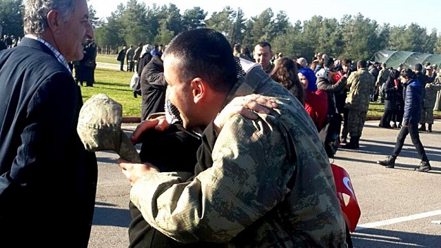Balıkesir’in Edremit İlçesinde 19 Motorlu Piyade Tugayı’nda eğitim gören 'Kısa Dönem Erler' düzenlenen tören ile yemin ettiler. Edremit 19 Motorlu Piyade Tugayı Ali Çetinkaya Kışlası'nda düzenlenen 369. Kısa Dönem Erlerin Yemin Töreni’ne çok sayıda asker yakını katıldı. Acemi Er Eğitimlerini başarıyla tamamlayan 369. Kısa Dönem Erler, silah arkadaşlarıyla birlikte düzenlenen yemin töreninde askerlerin, yakınları ile duygulu anları dikkat çekti. Tören askerlerin resmi geçit töreni ile sona erdi. (İHA)