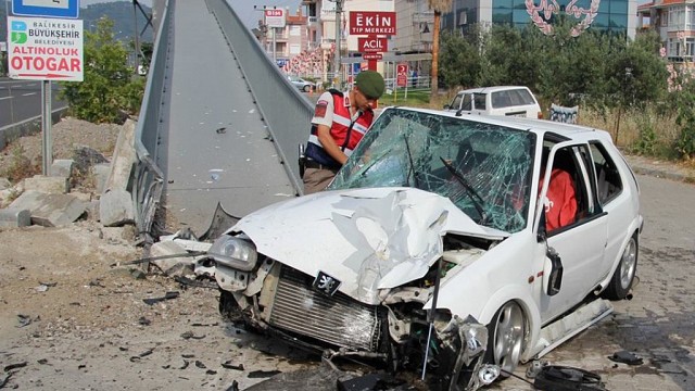 Balıkesir’in Edremit ilçesinde bir otomobil direksiyon hakimiyetini kaybederek üst geçidin korkulukların çarparak durdu. Ucuz atlatılan kazada, otomobil sürücü yaralandı. Edinilen bilgiye göre, kaza akşam saatlerinde Altınoluk Mahallesi E-87 karayolu üzerinde meydana geldi. İsimi öğrenilemeyen sürücünün kullandığı 10 LG 901 plakalı otomobil direksiyon hakimiyetini kaybederek üst geçidin girişine çarptı. Kazada otomobil sürücü yaralanarak hastaneye kaldırılırken, otomobilde büyük ölçüde maddi hasar meydana geldi. Jandarmanın kaza ile ilgili soruşturması sürüyor. (İHA)