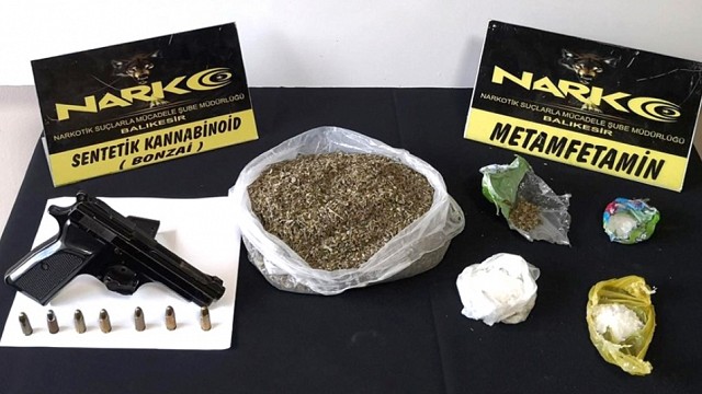 Balıkesir Valiliğinden yapılan basın açıklamasında şöyle denildi: 24.08.2020 tarihinde Edremit NSM Grup Amirliğince sokak satıcılarına yönelik olarak yapılan çalışmalar ve alınan istihbarı bilgiler ışığında Şüpheli İ.K. nın ilçemizde piyasaya sürülmek üzere yüklü miktarda uyuşturucu madde getirdiği yönünde alınan bilgi doğrultusunda gerekli çalışmalar yapılmış, şüpheli şahsın konakladığı pansiyon ve kiralamış olduğu günlük kiralık dairede, alınan karara binaen yapılan aramalar neticesinde; 1 poşet halinde 272.45 gram Metamfetamin maddesi, 1 kilitli poşet halinde 25.21 gram metamfetamin maddesi, 1 kilitli poşet halinde 25.18 gram metamfetamin maddesi, Olmak üzere toplam, Toplamda 322.84 gram Metamfetamin maddesi, 1 poşet halinde 6.40 gram esrar maddesi, 1 adet hassas terazi, Uyuşturucu madde satışından elde edildiği değerlendirilen 3235 TL para ele geçirilmiştir. Şüpheli İ.K 25.08.2020 Günü çıkarıldığı adli makamlarca tutuklanmıştır. Uyuşturucu madde ticareti ve kullanımını önlemeye yönelik çalışmalarımız aralıksız ve titizlikle devam etmektedir. Kamuoyuna saygıyla duyurulur. Haber: Pervin BÖLÜKBAŞI