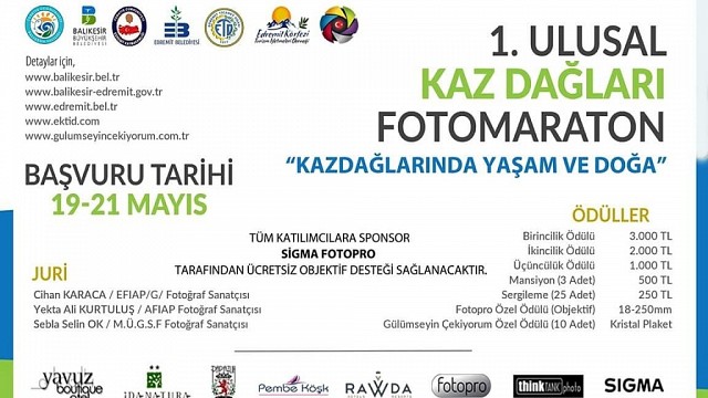 Balıkesir Büyükşehir Belediyesi ile Edremit Körfezi Turizm İşletmeleri Derneği ve Gülümseyin Çekiyorum Fotoğraf Kulübü, "Ulusal Kaz Dağları Foto Maratonu" düzenliyor. Yarışmaya hem profesyoneller hem amatör yarışmacılar katılabilecek, yarışma kapsamında 3 gün boyunca sunum ve söyleşi, moral gecesi, ödül töreni ile Türkiye’ de ilk defa bir objektif firması tarafından katılım sağlayan fotoğrafçılara ücretsiz olarak objektif desteği sunulacak. Yarışmada 19 Mayıs- 21 Mayıs 2017 tarihleri arasında Kaz Dağlarını ve köylerini kapsayan Foto Maraton düzenlenecek. Foto Maratona katılmak için Akçay’a gelen yarışmacılar 3 gün boyunca Kazdağları'nda fotoğraf çekecek. Yarışmada birinciye 3 bin, ikinciye 2 bin, üçüncüye 1 bin lira ödül verilecek. Ayrıca Sigma özel ödülü Zoom Lens, Gülümseyin Çekiyorum özel ödülü, sergilemeye layık görülen 25 fotoğrafın her birine ise 250 lira ödül verilecek. (İHA)