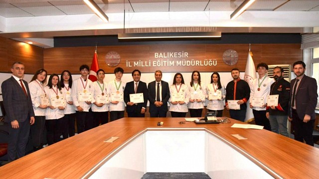 Balıkesir'de meslek liselerimiz, öğrencilerimize sağlam bir temel ve nitelikli bir eğitim sunarak onların kariyerlerine güçlü bir başlangıç yapmalarını sağlıyor. Balıkesir İl Milli Eğitim Müdürlüğünden yapılan açıklamada şöyle denildi, “Mesleki ve teknik eğitim veren kurumlarımız, öğrencilerimize hem teorik bilgi hem de pratik beceriler kazandırarak onları sektörde başarılı olmaları için hazırlıyor. "Yiyecek İçecek Hizmetleri" alanında öğrenim gören öğrencilerimiz, mezun olduklarında yemek sektöründe çeşitli kariyer fırsatlarına sahip oluyor. Meslek liselerimiz, gastronomi yolculuğunda gençleri destekleyerek sektördeki ihtiyaçlara cevap verecek nitelikli, profesyonel elemanlar yetiştiriyor. Bu bağlamda; Altın Kepçe Turizm ve Aşçılar Derneği tarafından düzenlenen 8. Uluslararası Gastronomi Yarışması'ndan başarılarla dönen Gazi Mustafa Kemal Mesleki ve Teknik Anadolu Lisesi öğrencilerimiz; İl Millî Eğitim Müdürümüz Ali Tatlı'yı ziyaret etti. 5-7 Şubat tarihleri arasında Antalya/Alanya'da düzenlenen yarışmada "Ana Yemek, En İyi Lise Ekip, Yöresel Yemekler, Uzak Doğu Asya, Makarna ve Balık Yemekleri" kategorilerinde hünerlerini sergileyen 10 öğrencimiz; 6 altın madalya ve 4 bronz madalya kazanarak yarışmadaki heyecan ve tecrübelerini Müdürümüz ile paylaştı. Yarışma sürecinde öğrencilerimizle beraber heyecan dolu atmosferi paylaşan öğretmenlerimiz ziyarette; farklı kategorilerde düzenlenen 8. Uluslararası Gastronomi Yarışması'nda 6 altın, 4 bronz madalya kazanan öğrencilerimizin emeklerinin gurur verici olduğunu; liderlik ve takım çalışması yeteneklerini de geliştiren öğrencilerimizin başarıya giden bu süreçte yanlarında olmaktan dolayı mutluluk ve gurur duyduklarını belirtti. İl Millî Eğitim Müdürümüz Ali Tatlı, "Yarışmalar; öğrencilerimize yaratıcılık ve yenilikçilik gibi özellikler kazandırırken problem çözme becerilerini de geliştirme imkânı sunuyor. Disiplin, iş birliği ve liderlik gibi önemli yetenekler ile gençlerimizi gastronomi dünyasına ilgi duymaya teşvik ederken aynı zamanda onların kişisel ve mesleki gelişimine katkıda bulunuyor. Düzenlenen yarışmaya katılarak ilimize madalyalarla dönen öğrencilerimizi tebrik ediyor bu başarıya katkı sunan herkese teşekkür ediyorum." ifadelerini kullandı.