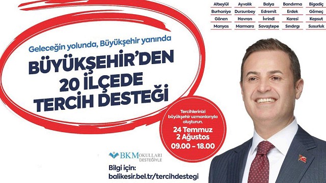 “Geleceğin yolunda, Büyükşehir yanında” sloganıyla üniversite sınavına giren gençlere, tercih döneminde faydalı olabilmek adına Balıkesir Büyükşehir Belediye Başkanı Ahmet Akın, 20 ilçede tercih noktaları açıyor. 24 Temmuz-2 Ağustos günleri boyunca her gün uzman eğitmenler, 09.00-18.00 saatleri arasında gençlere tercih desteği verecek.
