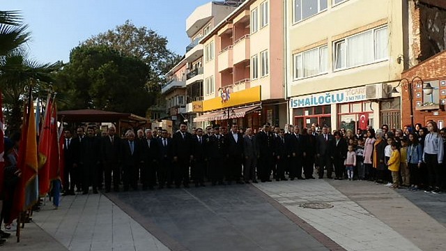 Atatürk'ü Anma Töreni'nin ilk bölümü olan saygı duruşu ve çelenk sunma Töreni Saat 08.45 te Atatürk Anıtı önünde başladı.Buradaki törene Kaymakam Şeref Aydın,İlçe Jandarma Garnizon Komutanı J. Kd. Bçvş.Süleyman Kılıç,Emniyet Müdürü Cumali Topaş,Belediye Başkanı Emin Ersoy,Siyasi Parti başkan ve yöneticileri,Dernek ve Oda Başkanları, Sivil Toplum Kuruluşu Başkanları,Resmi Daire Amirleri, İlk ve orta dereceli okul müdürleri,Görevli öğretmenler, bayrak ve flamaları ile her okulu temsilen birer grup öğrenci,Emniyet Mensupları, Belediye zabıtaları ve vatandaşlar katıldılar.Protokol sırasına göre Kaymakamlık ve Belediye Çelenkleri Atatürk Anıtı'na sunuldu.Tam saat 09.05 te siren sesi ile birlikte 2 dakikalık saygı duruşuna müteakip İstiklal Marşı okundu ve şanlı bayrağımız iki öğrenci tarafından iki ayrı göndere çekildi.Daha sonra bayraklar yarıya indirildi..Anıt önündeki ilk tören sona erdi.
