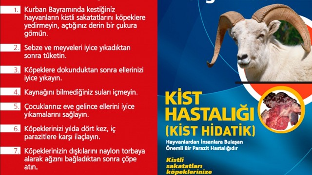 KİSTİK EKİNOKOKKOZİS (KİST HİDATİK) Havran Toplum Sağlığı Merkezinden yapılan basın açıklamasında, "Halk arasında kist hastalığı olarak bilinen bu hastalığın etkeni, Echinococcus Granulosus adı verilen bir parazittir. Bu parazitin esas kaynağı köpek, kurt, tilki gibi et yiyen hayvanlardır. Ancak, sıklıkla köpeklerdir. Parazit köpeklerin ince barsaklarında yaşar. Hastalık köpek dışkısı ile atılan yumurtalar ile insana bulaşır. Dışkıyla atılan yumurtalar hayvanların ayakları, arazi eğimi, rüzgar ve yağmurla yayılırlar. İnsanlar bu yumurtaları çiğ tüketilen ve iyi yıkanmamış meyve ve sebzelerden, kirli içme sularından alırlar. İnsandan başka koyun, keçi, sığır ve manda gibi otla beslenen hayvanlar da yumurtaları alarak hastalanırlar. Alınan bu yumurtalar, barsaklarda açılarak barsak duvarını geçer, kan ve lenf yoluyla öncelik sırasıyla karaciğer, akciğer ve diğer organlara yerleşerek kist formunda yaşamlarını sürdürürler. Kistler en sık karaciğer ve akciğerlerde görülürler. Nadiren dalak, karın zarı (periton), böbrek, kemik, göz yuvası, beyin, kalp ve yumurtalıklara da yerleşebilir. Organ ve sistem tutulumlarında bu bölgelere ait tablolar ortaya çıkar. Ülkemizde Kist Hidatik’in sorun olmasının nedenlerinden birisi de özellikle Kurban Bayramlarında yapılan kesimler sonrası kistli sakatatları gömmek yerine, köpeklere yedirmek ya da rastgele ortada bırakarak sokak köpeklerinin bu sakatatlarla beslenmelerine yol açmaktır. Ülkemizde, hayvanlarda bu hastalığın çok yaygın olması, insanlarda önemli halk sağlığı sorunlarına neden olması ve ciddi ekonomik kayıplara yol açması nedeniyle koruyucu önlemler almak hastalıkla mücadelede çok ciddi başarılar sağlamaktadır. Hastalıktan korunmak için; * Köpek ve kedilere mümkün olduğu kadar çiğ et verilmemelidir. * Kişisel temizlik kurallarına dikkat edilmeli, içme ve kullanma suları temiz olmalı, çiğ yenen sebze ve meyveler bol su ile iyice yıkandıktan sonra tüketilmelidir. *Kesilen veya ölen hayvanların kist bulunduran organları köpeklerin ve diğer etçil hayvanların ulaşamayacağı şekilde gömülerek bertaraf edilmelidir. Özellikle Kurban Bayramlarında bu hususlara daha çok dikkat edilmelidir. *Köpekler yılda dört kez iç parazitlere karşı ilaçlanmalıdır. *Köpekler gezdirilirken etrafa dışkılamaları halinde dışkıları alınarak poşete konulmalı, ağzı bağlandıktan sonra çöpe atılmalıdır. *Parazit mücadelesi yapılmadan serbest dolaşan köpeklerin okşanması ve sevilmesi sırasında parazit yumurtaları ellere geçebilir. Bu şekilde kirlenen ellerin yıkanmadan ağza götürülmesi ile parazitin yumurtası alınır. Bu nedenle, özellikle çocukların köpeklerle temasından sonra ellerini bol su ve sabunla yıkamaları sağlanmalıdır." denildi. Haber: Ayhan KUR