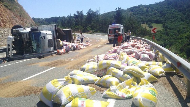 Havran ilçesinde yem yüklü kamyonun devrilmesi sonucu meydana gelen kazada tonlarca yem karayoluna dağılırken, şoför yaralandı. Edinilen bilgiye göre, kaza öğle saatlerinde Şapçı rampasında meydana geldi. Balıkesir istikametinden gelen Mustafa Özkan idaresindeki 10 SR 218 plakalı kamyon, sürücünün direksiyon hakimiyetini kaybetmesi sonucu yola devrildi. Yemler karşı şeride dağılırken, kamyon içinde sıkışan şoför ise itfaiye ekipleri tarafından kurtarılarak sağlık ekiplerine teslim edildi. Karayoluna saçılan yemler nedeniyle ulaşım 1 saat kontrollü şekilde sürdürüldü. Kazayla ilgili soruşturma sürüyor. (İHA)