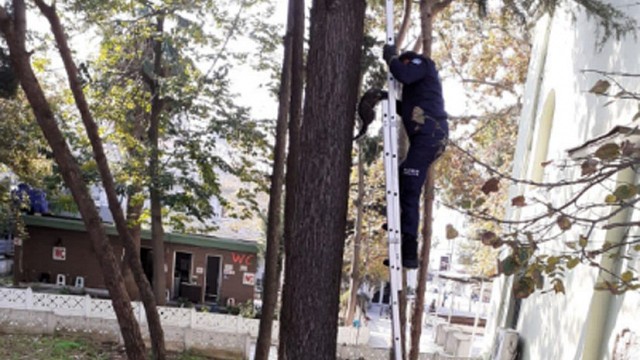 Balıkesir’in Ayvalık ilçesinde, ağaçta mahsur kalan yavru kediyi kurtarmak için itfaiye seferber oldu. Eski otogarda bir ağacın dalında mahsur kalan kediyi sabah saatlerinde okula giden öğrenciler fark etti. Okul çıkışında yavru kedinin halen daha ağaç dalında mahsur kaldığını fark eden iki öğrenci durumu itfaiyeye bildirdi. Balıkesir Büyükşehir Belediyesi İtfaiye Daire Başkanlığı’na bağlı bir ekip, merdivenli arozözün sepetinden daldaki kediye ulaşmak istedi. Ancak itfaiye erini gören kedi, ağaç dallarından atlayarak kaçıp gözden kayboldu. Vatandaşlar ise, yavru kedinin sabah saatlerinde sokak köpeklerinden kokup ağaca tırmandığını ve çıktığı ağaçtan inemediğini belirtti. (İHA)