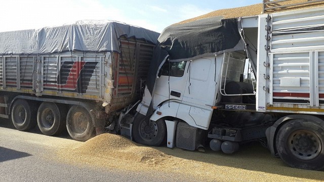 Balıkesir'in Bandırma ilçesinde buğday yüklü iki kamyonun karıştığı kazada bir kişi yaralandı. Bandırma-Balıkesir yolu Eti Maden kavşağında meydana gelen kazada, buğday yüklü İlyas Yılmaz idaresindeki 26 E 3774 kamyon, Aydoğan Akkurt yönetimindeki 26 BL 050 plakalı buğday yüklü kamyona arkadan çarptı. Kazada İlyas Yılmaz yaralanırken, kamyonlarda yüklü bulunan buğdaylar yola saçıldı. İtfaiye ekipleri kaza yerine gelerek, yaralı İlyas Yılmaz'ı araçtan çıkararak 112 ekiplerine teslim etti. Kazada yaralanan sürücü Bandırma Devlet Hastanesi'nde tedavi altına alınırken, kazaya karışan kamyonların çekilmesinin ardından yola dökülen buğdaylar da Karayolları ve itfaiye ekipleri tarafından temizlendi. (İHA)