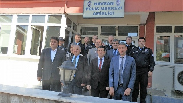 Havran Kaymakamı Ahmet Türköz beraberinde Havran Belediye Başkanı Emin Ersoy ve Resmi Daire Amirleri ile birlikte Polis Haftası nedeniyle geçtiğimiz gün saat 11.30 da Havran Emniyet Müdürlüğü'ne bir ziyarette bulundu. Kaymakam Ahmet Türköz ve protokol üyeleri İlçe Emniyet Müdürü İsmail Tur ve görev başındaki emniyet personeli tarafından giriş kapısında karşılandı. İlk önce Merkez Karakol Amirliği'ni ziyaret eden protokol üyeleri görevi başındaki personelin Polis Haftası'nı kutladılar. Daha sonra İlçe Emniyet Müdürü İsmail Tur'un makam Odası'na geçerek karşılıklı görüş alış verişinde bulundular. Emniyet personeli protokol üyelerine baklava, meyve suyu ikramında bulundular.İlçe Emniyet Müdürü İsmail Tur;Kaymakam Ahmet Türköz,Belediye Başkanı Emin Ersoy ve protokol üyelerine ziyaretlerinden duyduğu memnuniyeti dile getirerek teşekkür etti. Haber ve fotoğraf: Ayhan KURT