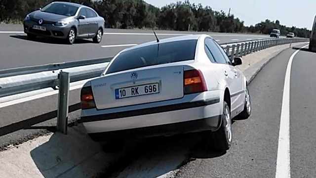 Balıkesir'de sürücüsünün direksiyon hakimiyetini kaybettiği otomobil, refüjdeki korkuluklara çarparak durdu. Edinilen bilgiye göre kaza, öğle saatlerinde Havran çıkışında meydana geldi. Hakan G. idaresindeki 10 RK 696 plakalı otomobil, sürücünün direksiyon hakimiyetini kaybetmesi sonucu refüjdeki beton yağmur kanalına girip, korkuluklara çarparak durdu. Kazadan sürücü yara almadan kurtulurken, ön tekeri fırlayan araçta maddi hasar meydana geldi. Kazayla ilgili inceleme sürüyor. (İHA)