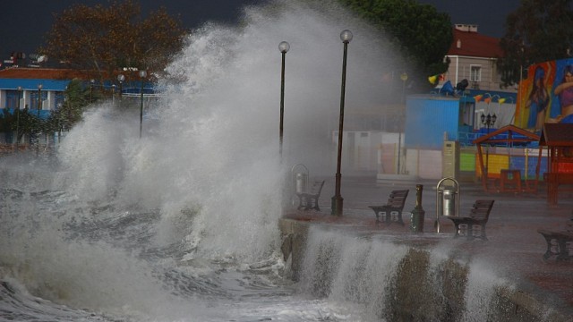 Balıkesir'in Edremit Körfezi'nde şiddetli lodos nedeniyle boyları 3 metreyi bulan dalgalar adeta sahilleri dövüyor. Zaman zaman hızı 70 kilometreye çıkan fırtına, özellikle Edremit'in Akçay, Zeytinli, Güre ve Altınoluk Mahallelerinde etkili oluyor. Rüzgar nedeniyle sahillerde bulanan bazı işletmelerin güneşlik çadırlarının parçalandığı gözlenirken, boyları 3 metreyi bulan dev dalgalar sahilleri adeta dövüyor. Lodosun gün içinde şiddetini artırarak devam etmesi bekleniyor. (İHA)