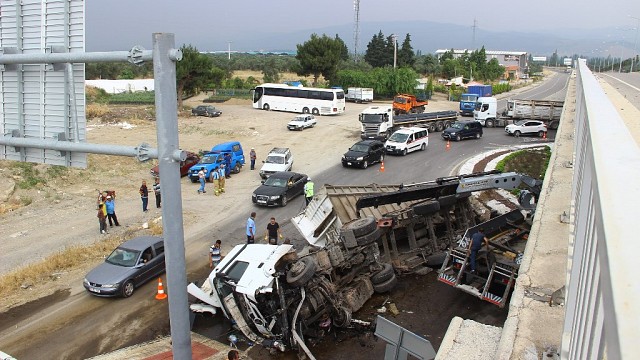 Lastiği patlayan tır köprülü kavşaktan uçtu, 1 yaralı