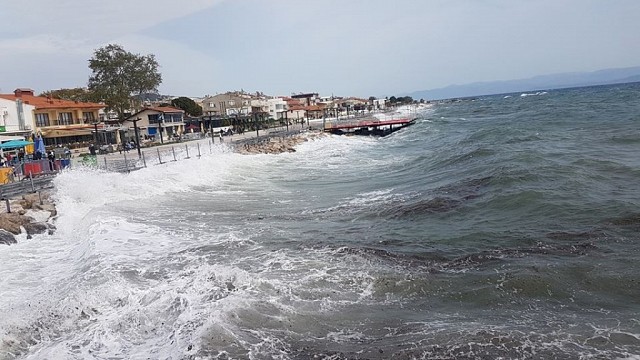 Balıkesir'in Edremit, Burhaniye, Gömeç ve Ayvalık ilçelerinde etkili olan lodos fırtınası dev dalgalar oluşmasına neden oluyor. Öğle saatlerinde şiddetini artıran lodos fırtınası Edremit, Burhaniye, Gömeç ve Ayvalık ilçelerinde hayatı olumsuz etkiliyor. Edremit'in Akçay Mahallesi sahilinde meydana gelen dev dalgalar sahilleri dövüyor. Yetkililer lodos fırtınası nedeniyle vatandaşları yaşanabilecek olumsuzluklara karşı hazırlıklı olmaya çağırdılar. (İHA)