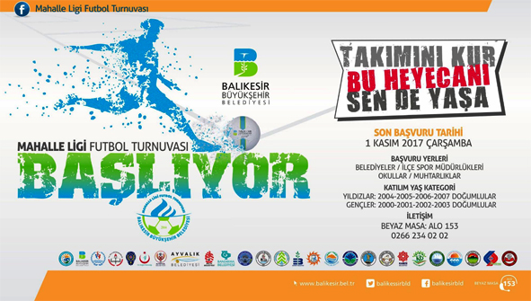 Balıkesir Büyükşehir Belediyesi tarafından düzenlenen Balıkesir Valiliği, tüm ilçe belediyeleri ve tüm kamu kurum ve kuruluşları tarafından desteklenen"İmkan Bizden Oynamak Sizden" Mahalle Ligi Turnuvası başvuruları için son başvuru tarihleri 1 Kasım’da… Balıkesir Büyükşehir Belediyesi tarafından “İmkân Bizden Oynamak Sizden” sloganıyla bu yıl dördüncüsü düzenlenecek olan Mahalle Ligi Futbol Turnuvası ile çocuklara ve gençlere ulaşmak, onların spor yapmalarına imkân sunmak amaçlanıyor. Balıkesir Büyükşehir Belediyesi tarafından organize edilen ve ilçe belediyelerin düzenlemesi ile gençleri spora teşvik amaçlı düzenlenen mahalle ligi futbol turnuvaları son başvuru tarihi 01 Kasım 2017 olarak belirtildi. Mahallelerde takımını kuran gençlerin İlçe spor müdürlükleri, ilçe belediyeleri okullar ve muhtarlıklara başvurmaları turnuvalar için yeterli olacak. Yıldızlar kategorileri için 2004-2005-2006-2007 doğumlular, gençler kategorisi için 2000-2001-2002-2003 doğumlular başvurabilecekler.
