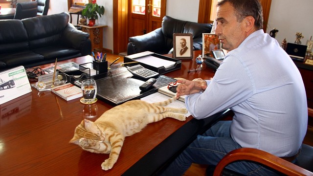 Balıkesir'in Ayvalık ilçesinde belediye başkanını ziyaret edenler, makam masasının vazgeçilmezi 'Limon' isimli kedi ile tanışıyorlar. Bir sokak kedisi olarak yavru iken belediyeye sığınan ve Ayvalık Belediye Başkanı Rahmi Gençer tarafından sahiplenilen kedi, yaklaşık 2 yıldır makam masasını kendine mesken tuttu. Ayvalık Belediye Başkanı Rahmi Gençer, tatil bölgelerinde terk edilen kedi ve köpeklerin sokaklara bırakıldığını ifade ederek, "Sorunlarımızdan bir tanesi özellikle yazın Ayvalık'a gelip yaz tatilini geçiren burada evi olanların, yaz tatili bitince bu hayvanları sokakta bırakıp gitmeleri. Kedilerimizi, köpeklerimizi, sokak dostlarımızı bırakmaları bizi çok üzüyor. Bu çok büyük bir sorun. Ben buradan rica ediyorum. Tam tersini yapalım. Sokak hayvanlarını sahiplenelim" dedi. Limon adlı kedinin büyük ilgi gördüğünü ifade eden Başkan Gençer, "Ayvalık sevgi üzerine kurulmuş teması olan bir şehir. O yüzden sokak hayvanlarımıza sahip çıkalım. Limon'u görenler ilk görüşte şaşırıyor. Vatandaşlarımızın bir kısmı da korkuyor. Buraya gelince alışanlar da olmaya başladı. Personelden çok korkan vardı. Ancak daha sonra korkularını attılar. Bence faydalı oluyor. En azından sahiplenme duyguları artıyor. Bazı personel arkadaşlar burada kediler ile tanışınca evlerine kedi almaya başladı" diye konuştu. Gününün büyük bir kısmını Belediye Başkanı Rahmi Gençer'in çalışma masası ve makam koltuğunda geçiren Limon, adeta ilçenin yeni maskotu haline geldi. (İHA)