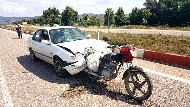 Balıkesir'de meydana gelen trafik kazasında aynı yönde giden motosiklet ve otomobil çarpıştı. Motosikletin otomobile adeta ok gibi saplandığı kazada 2 kişi yaralandı. Edinilen bilgiye göre, Balıkesir’in Bigadiç ilçesi Babaköy yol kavşağında meydana gelen kazada 2 kişi yaralandı. Mustafa Alkan’ın kullandığı 10 K 4102 plakalı otomobil, Bigadiç’ten Balıkesir’e seyir halindeyken, önünde seyreden Ahmet Özdemir’in kullandığı 10 Y 2844 plakalı motosiklete çarptı. Otomobilin çarpmasıyla motosikletten savrulan Ahmet Özdemir ile arkasında oturan Ayşe Özdemir, yere düşerek yaralandı. Yaralılar, çevredekilerin ihbarı üzerine olay yerine gelen sağlık görevlileri tarafından kaza yerindeki ilk müdahalenin ardından Bigadiç Devlet Hastanesi'ne kaldırıldı. Kaza anında motosikletin arka tekerleğinin, otomobilin ön kaputuna girdiği görülürken, motosikletin iki tekerlek üzerinde kalması ilginç görüntüler oluşturdu. (İHA)