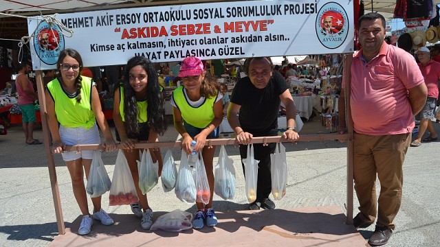 Balıkesir’in Ayvalık ilçesinde, Mehmet Akif Ersoy Ortaokulu öğrencileri Mayıs ayı başında başlattıkları örnek projeleri Askı’da Sebze ve Meyve Uygulaması’nı okulların yaz tatilinde olduğu bu günlerde de tüm hızıyla gönüllü olarak sürdürüyorlar. Mehmet Akif Ersoy Ortaokulu öğrencilerinin ‘Kimse aç kalmasın, ihtiyacı olanlar askıdan alsın’ ve ‘Hayat Paylaştıkça Güzel’ sloganlarıyla başlattıkları proje kapsamında; Ayvalık’ta Perşembe ve Pazar günleri kurulan semt pazarlarında hazırladıkları stantlarda veren el ile alan el arasında gönül köprüsü kuran öğrencilere, vatandaşlar da tam destek veriyor. Ayvalık Sebze ve Meyveciler Odası ile Ayvalık Belediyesi ve pazarcı esnafının da katkılarıyla sürdürülen uygulamaya ihtiyaç sahibi vatandaşların yoğun ilgi göstermesi dikkatlerden kaçmıyor. Hayata geçirdikleri sosyal projeyi arkadaşları yaz sezonu süresince tatil yaparken, gönüllü olarak sürdüren öğrencilerden İrem Sarızeybek, yaz tatilini bir kenara bırakıp semt pazarlarında kurdukları Aksıda Sebze-Meyve standından yoksul ve ihtiyaç sahiplerine yiyecek ulaştırmanın kendisi için tarifi imkansız bir haz olduğunu vurgulayarak, “Onların bizlere ihtiyaçları var ve onlara yardım etmeliyiz” dedi. Ayvalık’a, Düzce’den misafir olarak gelen öğrencilerden Sudenaz Boz, “Çok güzel bir uygulama. Bu yardım kampanyasına bende gönüllü olarak destek veriyorum. Fakirlere yardımcı olabilmek benim içinde çok güzel bir duygu.” ifadelerini kullandı. Öğrencilerinin yaz tatilini bir tarafa bırakıp, 4 ay önce başlattıkları ‘Askıda Sebze-Meyve’ uygulamasına destek vermesinden duyduğu gururu ifade eden Okul Müdürü Mustafa Kurtuluş ise; “Çocuklarımıza yardımseverliği ve sorumluluğu aşılamak adına aşlatmış olduğumuz bir projeydi bu. Süresi içerisinde bu proje hiç aksamadan Ayvalık’ın perşembe ve Pazar günleri kurulan semt pazarlarında devam ediyor. Bu pazarlarda yine kendimizin hazırladığı stantlarımızda öğrencilerimiz gönüllü olarak görev yapıyorlar. Duyarlı halkımızın standımıza astıkları sebze ve meyve poşetleri, öğrencilerimizin gözetiminde yoksul ve ihtiyaç sahiplerine ulaştırılıyor. Çocuklarımız bu vesile ile yardımlaşmanın önemini, insanlarla paylaşmanın önemini kavrıyorlar. Bununla birlikte bir vatandaş olarak, üzerlerine düşen sorumluluk ve görevi yerine getirmenin de mutluluk ve hazzını yaşamış oluyorlar. Bu uygulama aslında yaşanılacak öğrenilecek çok güzel bir tecrübe. Tok’un açın halinden anlamasını yaşayarak öğreniyorlar.” dedi. Öğrencilerin yaz tatilini bir yana bırakarak, semt pazarlarında güneşin altında görev yapmalarının, onların bu sorumluluğu ve paylaşma duygusunu kavradıklarının en önemli bir göstergesi olduğunu savunan Mustafa Kurtuluş, “Ben bu öğrencilerimizi ve ailelerine yürekten teşekkür ediyor, böyle iyi bir evlat yetiştirdikleri için onları can-ı gönülden kutluyorum” diye konuştu. Okulun mezun olan öğrencilerden Kübra Yılmaz da, “Okuldaki arkadaşlarımın bu uygulamayı başlattıklarını duymuş ve çok mutlu olmuştum. Arkadaşlarımın bu konuda duyarlı olmaları beni çok sevindirdi. Onların yoksul insanlara yönelik bu hassasiyetleri beni de son derece sevindirdi. Onları tebrik ediyorum” ifadelerin kullandı. (İHA)