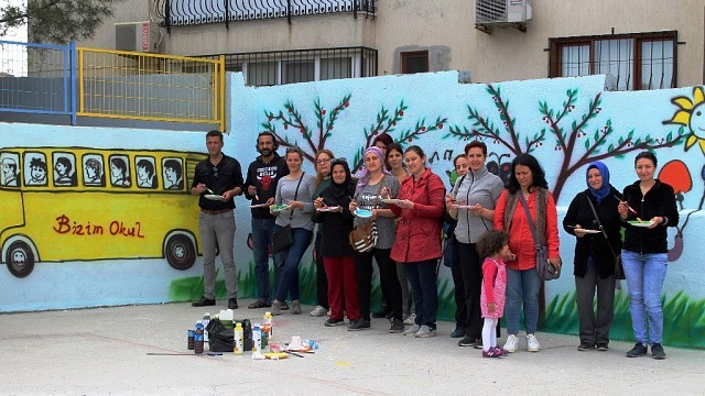 Okul bahçesinin duvarına ilkbaharı getirdiler