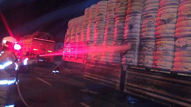 Edremit-Çanakkale karayolunda ilerlemekte olan tırın kasasında bulunan pamuklar alev aldı. Olası facia itfaiye ekiplerinin kısa sürede yangına müdahale etmesi sonucu önlendi. Edinilen bilgiye göre, kaza, ilçeye bağlı Narlı Mahallesi mevkii Çanakkale karayolu üzerinde meydana geldi. Çanakkale istikametine gitmekte olan 35 LZ 76 plakalı pamuk yüklü tırın dorsesinde bulunan pamuklar bilinmeyen nedenle yanmaya başladı. Sürücü ise durumu hemen fark edip, itfaiye haber verdi. Ekiplerin kısa sürede müdahale ettiği yangın, tüm paketlenmiş pamukları sarmadan söndürülürken, olası facia önlendi Yangının çıkış nedeni araştırılıyor. (İHA)