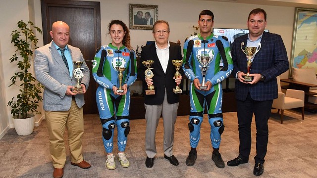 BÜYÜKŞEHİR SPORCULARINDAN BİR BAŞARI DAHA İzmir’de gerçekleştirilen Türkiye Motosiklet Pist Şampiyonası 1.Etap Yarışında 1.olan Büyükşehir Belediyesi sporcusu Ali Efe Yeğin, kazandığı kupayı Büyükşehir Belediye Başkanı Ahmet Edip Uğur’a takdim etti. İzmir’de gerçekleştirilen Türkiye Motosiklet Pist Şampiyonası 1.Etap Yarışında 1.olan Büyükşehir Belediyesi sporcusu Ali Efe Yeğin ve kendisi gibi sporcu olan eşi Bener Gülşah Yeğin kazandıkları kupaları Büyükşehir Belediye Başkanı Ahmet Edip Uğur’a takdim etti. Geçtiğimiz aylarda uluslar arası yarışmalarda da dereceler elde eden Yeğinler, başarılarını sürdürmek istediklerini söylediler. Bulgaristan’da düzenlenen yağmurlu yarışta da birinci olduğunu ifade eden Ali Efe Yeğin, Romanya ve Bulgaristan’da İstiklal Marşı’nı okutmanın gururunu yaşadıklarını söyledi. Önümüzdeki haftalarda Romanya’da düzenlenecek olan Avrupa Şampiyonası’nda Türkiye, Balıkesir ve Büyükşehir’i en iyi şekilde temsil etmek istediklerini belirten Yeğin, desteklerinden ötürü Başkan Uğur’a teşekkür etti. Başkan Uğur’da başarılarından dolayı sporcuları kutlayarak “Hem Türkiye’yi hem de Balıkesir’i temsil ediyorsunuz. Başarılarınızın devamını diliyorum. Spora ve sporculara desteğimiz sürecek” dedi.
