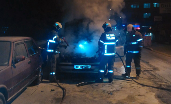 Balıkesir'de seyir halindeyken alev alan araç, itfaiye ekipleri tarafından söndürüldü. Edinilen bilgiye göre, Kasaplar Mahallesi Altıeylül Kaymakamlığı binası önünde hareket halindeyken yanmaya başlayan araç, korku dolu anlar yaşattı. Turgay M. isimli vatandaşa ait aracın kaput kısmından hareket halindeyken dumanlar yükselmeye başladı. Yanmaya başlayan araca olay yerine gelen itfaiye ekipleri müdahale etti. Uzun uğraşlar sonrası söndürülen araç kullanılamaz hale gelirken, olayda yaralananın olmadığı öğrenildi. Yangın anı ise bir vatandaş tarafından cep telefonuyla görüntülendi. (İHA)