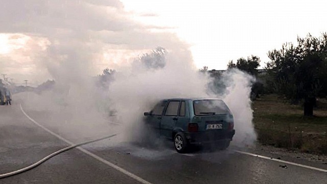 Balıkesir’in Edremit ilçesinde seyir halindeki bir otomobilde elektrik kontağından yangın çıktı. Araç, sürücünün gözleri önünde yandı. Edinilen bilgiye göre, Kızılkeçili yolu üzerinde seyir halinde olan 10 N 7520 plakalı Ramazan S. yönetimindeki özel otomobil, elektrik kontağından çıktığı sanılan yangın sonrasında alev aldı. Sürücü bir anda araçtan duman çıkması üzerine aracı yol kenarına park ederek, otomobilden uzaklaştı. Durumun hemen itfaiyeye haber verilmesiyle olay yerine gelen Edremit itfaiye ekipleri, kısa sürede yangını söndürdü. Araçta maddi hasarın büyük olduğu öğrenildi. (İHA)