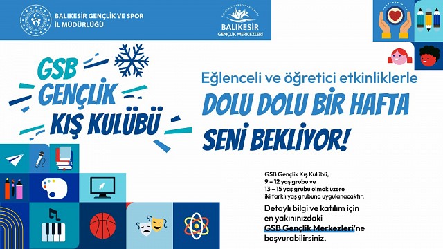Gençlik ve Spor Bakanlığı tarafından hayata geçirilen GSB Gençlik Kış Kulübü Projesi kapsamında, 19 Ocak – 31 Ocak 2026 tarihleri arasında Balıkesir Gençlik ve Spor İl Müdürlüğüne bağlı Gençlik Merkezlerinde öğrencileri dopdolu bir etkinlik programı bekliyor. Balıkesir Gençlik ve Spor İl Müdürlüğü’nden yapılan basın açıklamasında, “Proje, 9–12 yaş ve 13–15 yaş gruplarındaki gençlere yönelik olarak sosyal, kültürel ve sportif alanlarda zengin içerikler sunuyor. Proje; öğrencilere eğlenceli ve öğretici bir tatil ortamı sunarken, bireysel gelişimlerini desteklemeyi, sosyal becerilerini güçlendirmeyi ve takım çalışması bilincini kazandırmayı amaçlıyor. Tatil boyunca öğrenciler, keyifli etkinliklerin yanı sıra yeni beceriler edinme imanı bulacaklar. Gençlik Merkezlerinde gerçekleştirilecek programlar kapsamında öğrenciler; Akıl ve Zeka Oyunları, Bilgi Yarışmaları ve İletişim Becerilerini Geliştirme Oyunları ile düşünme, problem çözme ve kendini ifade etme becerilerini geliştirecekler. Sportif Faaliyetler, Hareketlendirici Oyunlar, Sabah Sporu, Sokak Oyunları ve Halk Oyunları sayesinde aktif bir yaşam tarzı benimseyerek fiziksel gelişimlerini destekleyecekler. Bunun yanı sıra El Sanatları ve Görsel Sanatlar, Drama/Tiyatro, Sahne Sırası Sende ve Güzel Konuşma Sanatı etkinlikleri ile öğrencilerin sanatsal yönleri güçlenirken, özgüvenleri ve kendilerini ifade etme becerileri artacak. Değerler Eğitimi, Değerler ve Etik, Gönüllülük Faaliyetleri ve sosyal sorumluluk çalışmalarıyla milli, manevi ve ahlaki değerlerin kazandırılması hedefleniyor. Programda yer alan Tanışma Oyunları, Takım Çalışması Etkinlikleri ve İl Gezisi gibi faaliyetler sayesinde öğrenciler; sosyalleşme, iş birliği yapma ve yaşadıkları şehri daha yakından tanıma imkanı bulacaklar. Tatillerini keyifli ve verimli geçirmek isteyen öğrenciler, GSB Gençlik Kış Kulübü kapsamında sunulan eğlenceli ve öğretici programlara katılmak için en yakın Gençlik Merkezine başvurarak programa dahil olabilirler.” Denildi. Haber: Hasan AKAR