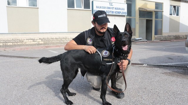 Şırnak’ta başarılı narkotik operasyonlarla adını duyuran dedektör polis köpeği Bath, Balıkesir’e tayin oldu. Balıkesir İl Emniyet Müdürlüğü Narkotik Suçlarla Mücadele Şubesi bünyesinde görev yapan detektör köpek Bath, terbiyecisi olan polis memuru ile birlikte birçok başarılı operasyona imza attı. Uyuşturucu tacirlerinin korkulu rüyası haline gelen Bath’ın operasyon öncesi hazırlık çalışmalarına İhlas Haber Ajansı konuk oldu. Bath, terbiyecisi polis memurunun talimatları doğrultusunda görevini başarıyla yerine getirdi. Saklanan uyuşturucu maddeleri zorlanmadan bulan detektör köpek Bath, katıldığı operasyonlarda da çok miktarda uyuşturucu maddenin bulunmasında önemli rol oynadı. 3 yaşındaki Bath, doğumundan itibaren Ankara’da aldığı eğitim sonrasında Şırnak’ta 2 yıl görev yaptı ve 2 ay önce Balıkesir’e tayin oldu. Terbiyecisi Bath ile 3 yıldır beraber olduğunu anlatarak, “Şırnak’ta 2 yıl görev yaptık. Kendisiyle 3 yıldır beraberiz. Balıkesir iline tayin olduk, şu anda Balıkesir’de beraber çalışıyoruz. Her türlü araç araması, ikamet araması ve uygulama noktalarında görev yapıyoruz. Köpeğimiz 8 adet uyuşturucu maddeye hassas. Bu 8 adet uyuşturucu maddenin kokusunu aldığı an hepsine tepki verme özelliğine sahip. Köpeğimiz 3,5 aylık eğitim sürecini başarıyla bitirerek göreve başlamış bulunmakta. Balıkesir ilimizde yaptığımız çalışmalarda köpeğimizle ikamet, araç aramalarında yakaladığımız maddeler var. Köpeğimiz insanın gözüyle göremeyeceği, eliyle kolay kolay ulaşamayacağı zula diye tabir ettiğimiz araç ve ikametlerdeki gizli bölmeleri bulmada bize yön gösteriyor ve yardımcı oluyor” dedi. (İHA)