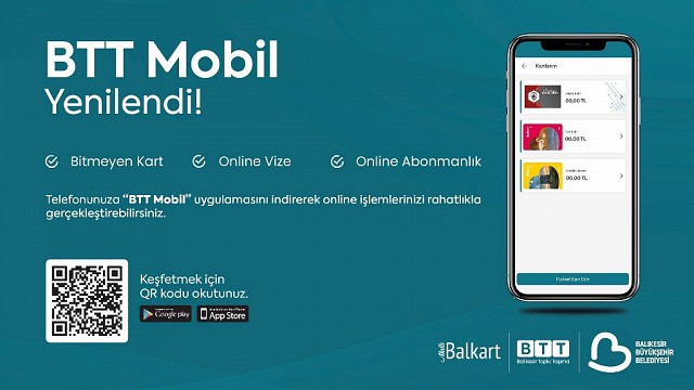 Cep telefonlarına indirilerek kullanılan BTT Mobil’de ‘Bitmeyen Kart’, ‘Online Vize’ ve ‘Online Abonmanlık’ işlemleri kısa sürede rahatlıkla yapılabiliyor. “Bitmeyen Kart” uygulamasını hizmete sunan BTT, online işlemler sayesinde BALKART para yükleme sistemini kolaylaştırdı. BALKART’a kredi kartı ile otomatik yükleme talimatı verilerek BALKART alt limiti belirlenecek. Otomatik yükleme talimatıyla BALKART bakiyesi belirlenen alt limite düştüğünde otomatik olarak TL yüklenebilecek. Bu sayede BALKART bakiyesi bitmeden, vatandaşlar kesintisiz ulaşım imkânından yararlanabilecekler.