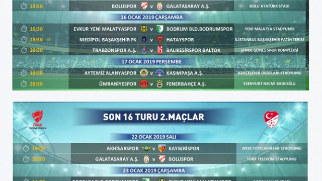 Ziraat Türkiye Kupası son 16 Turu'nda oynanacak olan maçların programı belli oldu. Ziraat Türkiye Kupası Son 16 Turu maç programı açıklandı. Son 16 turunda ilk maçlar 15, 16 ve 17 Ocak tarihlerinde, rövanşları ise 22, 23 ve 24 Ocak tarihlerinde oynanacak. Türkiye Futbol Federasyonu'ndan açıklanan müsabaka programı şu şekilde: Son 16 Turu ilk maçlar 15 Ocak Salı 16.00 Kayserispor- Akhisarspor 18.00 Antalyaspor-Göztepe 19.50 Boluspor-Galatasaray 16 Ocak Çarşamba 16.30 E.Y.Malatyaspor- Bodrum BLD. Bodrumspor 18.30 Medipol Başakşehir-Hatayspor 20.30 Trabzonspor-Balıkesir Baltok 17 Ocak Perşembe 18.30 Aytemiz Alanyaspor- Kasımpaşa 20.30 Ümraniyespor-Fenerbahçe Son 16 Turu ikinci maçlar 22 Ocak Salı 18.00 Akhisarspor- Kayserispor 20.30 Galatasaray-Boluspor 23 Ocak Çarşamba 14.00 Bodrum BLD. Bodrumspor - E.Y.Malatyaspor 18.00 Göztepe-Antalyaspor 20.30 Balıkesirspor Baltok- Trabzonspor 24 Ocak Perşembe 13.00 Hatayspor-Medipol Başakşehir 18.00 Kasımpaşa-Aytemiz Alanyaspor 20.30 Fenerbahçe-Ümraniyespor (İHA)